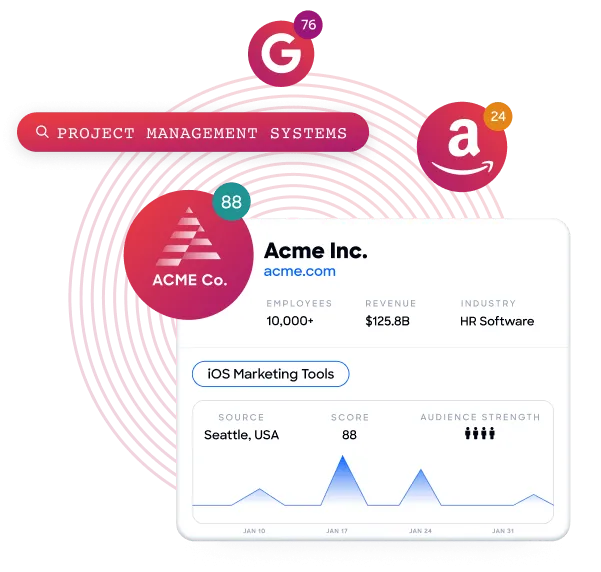Map your ideal customer profile against B2B database to uncover sales-ready prospects searching for topics and keywords related to your business. Our intent engine triggers signals tracked from a network of 210 million IP to Org Pairings and more than 6 trillion new keyword-to-device pairings — all sourced monthly from over 90% of accessible devices across the U.S.